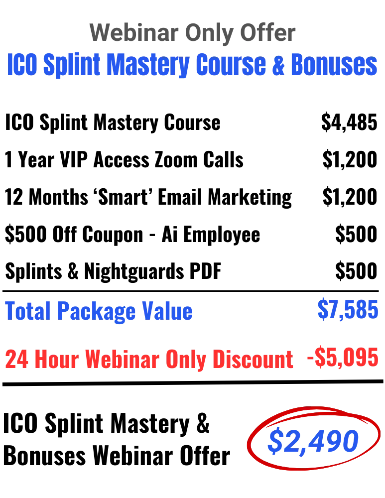 Get the ICO Splint Mastery Course and train with it for 1 full year. If for any reason, you change your mind, or you don't feel like you've received a world class education and are able to confidently provide your patients with a better, stress-free solution using the ICO Splint Protocol, just let us know. We'll refund 100% of your purchase price.