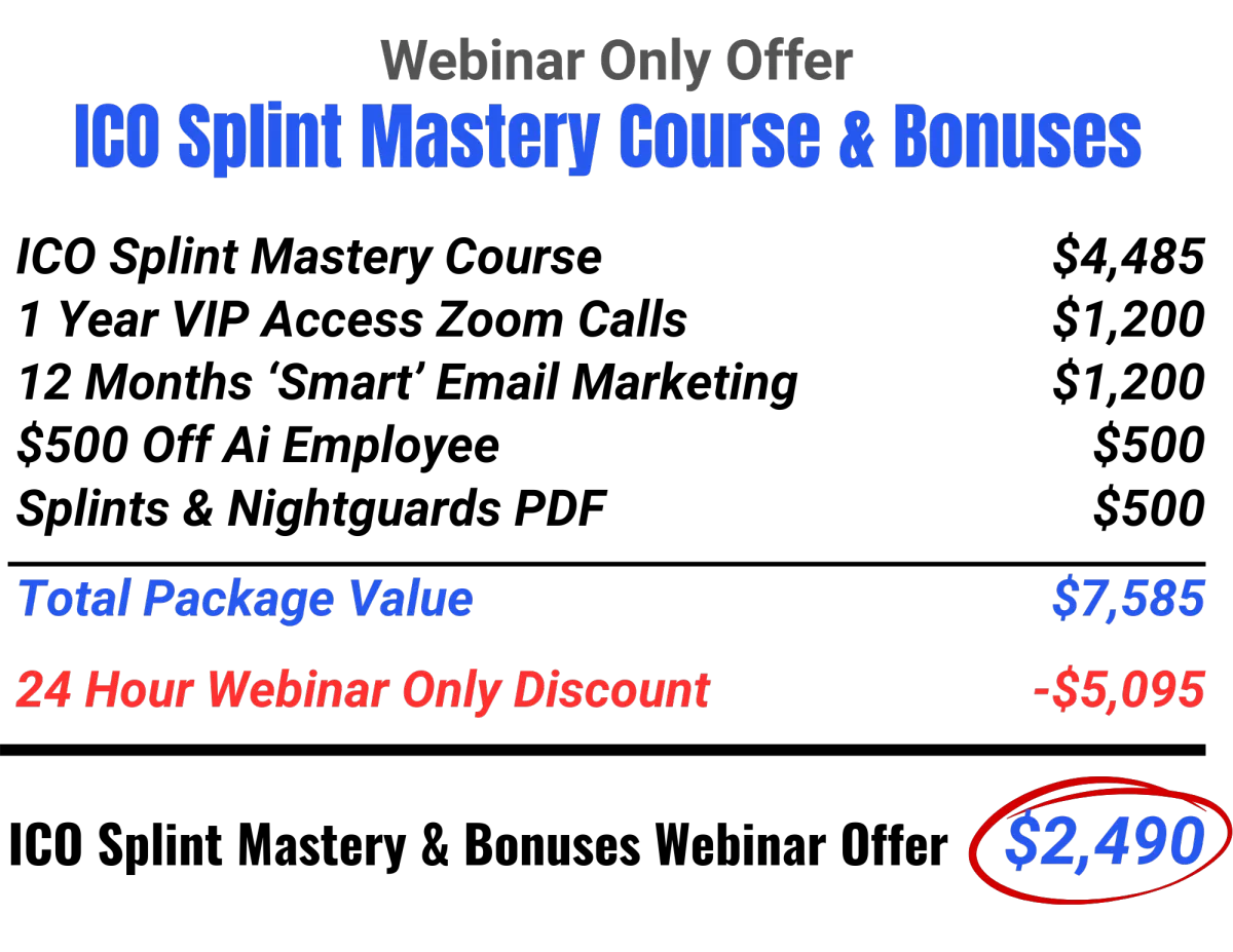 $500 Off an Ai Employee that will send out your email campaigns for you automatically, follow up with everyone, answer questions by voice or text, and help patients schedule an appointment. Your Ai Employee knows everything about your practice as well as splints and nightguards.